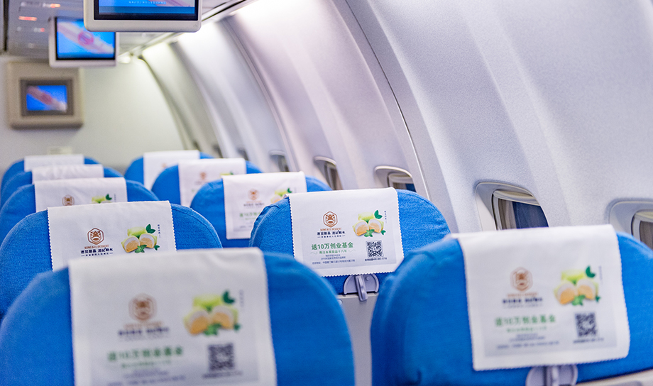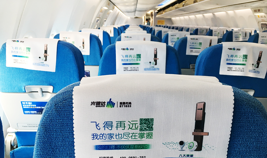 一進(jìn)入機(jī)艙,每個(gè)座椅上醒目統(tǒng)一的頭片廣告,全艙集中呈現(xiàn),營(yíng)造出一種沖擊力極強(qiáng)的視覺